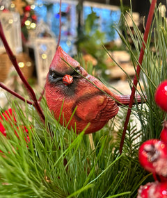 This is a front facing design meant to be placed where there would be a wall behind it or at a hospital where it is viewed from one side. It’s a great choice for a retirement or nursing home as well since there is limited space in those rooms. It features a cardinal bird, branches, winter foliage and a selection of red and white flowers all designed in a cardinal motif metal container.