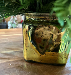 The fresh scent of a winter evening comes from greenery such as pine, silver fir and cedar. Blooms include hydrangeas, roses, carnations or Pom poms accented by pine cones, holiday ribbons, and berries/balls all arranged in a short gold mercury glass cube vase