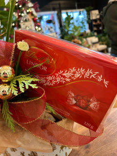 The best of both worlds: a festive holiday arrangement AND a box of Lindor Lindt chocolates set into a metal container with a holiday motif on it.