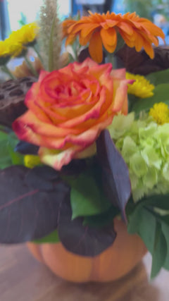 This fresh centrepiece is done in a ceramic pumpkin using fall blooms and colours. This is an adorable gift to bring to dinner or to send on delivery. We will use a variety of bloom types to create this design, it may not be indentical to the picture done, but it will be just as beautiful. We will use the freshest blooms in fall shades we have in the shop on the day you order it.