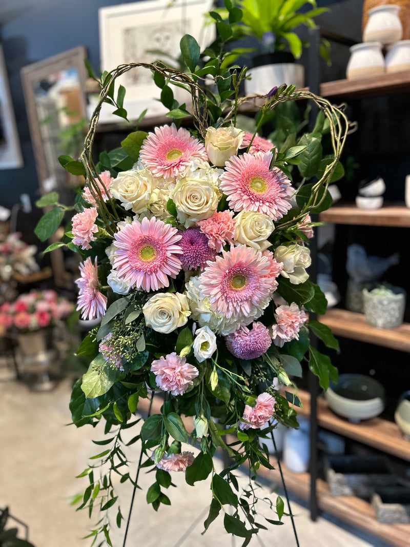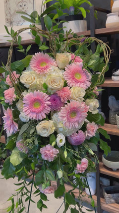 This blush pink, white and mauve standing spray features a willow heart shape in it, in memory of your loved one. We will make this as close as possible to the photo however on occasion we may need to substitute exact bloom styles to maintain the same colour pallette depending on what we have in stock. Does not include stand (the funeral home already has stands)