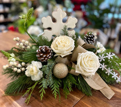 This lovely and fragrant winter centrepiece features pine, silver fir and cedar along with white blooms such as carnations, roses and Star of Bethlehems. To complete the look you’ll find a large rustic snowflake, pine cones and icy berries with holiday ribbon.