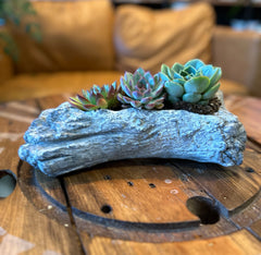 This is a collection of succulents planted into a faux driftwood container. Perfect for a desk, coffee table, office or just about anywhere. We make these to order, and we use a variety of different types of succulents. (Yours may or may not have these exact same succulents, but it will still be beautiful)