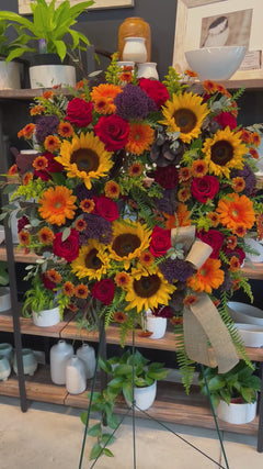 This fresh wreath in vibrant colours is a lovely remembrance at a service or celebration of life. It's is done in all reds, oranges, yellows, purples and browns with foliage. We will use flowers in these colours that are in season when you place your order, so the exact bloom types may vary but the overall colour scheme and feeling will remain the same. This design includes some dried product as well as the fresh.