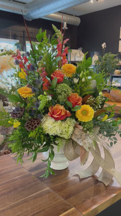 This one sided, tribute in memory of a loved one is done in warm shades such as cream, white, peach, orange and yellows with natural rustic accents added to it. We will make your tribute arrangement as close as possible to the sample in the photo, but we may need to substitute bloom styles to maintain the colour pallette from time to time, depending on the season and availability of blooms. We will still make it beautiful.
