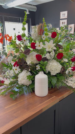 This arrangement gently hugs a Cremation Urn, (Represented by a white vase in our photo). We will choose white blooms and feature red roses along with some natural elements for this design such as lotus pods or cattails. We will use what is seasonal in white blooms, along with red roses.