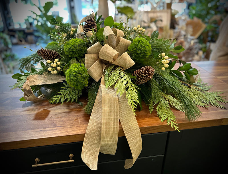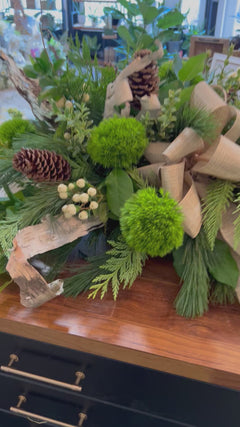 This casket spray is done in a very natural, Muskoka style, with very minimal flower blooms in it. It is done with a variety of greenery and foliage, pine cones, birch bark, burlap ribbon, white berries and green dianthus.