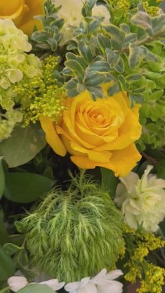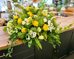 This sunny Casket Spray is made upon soft and brighter yellows, celadon and emerald greens along with creamy whites.